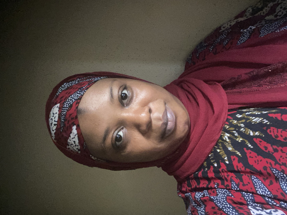 A single adult female is depicted in a close-up, head-and-shoulders portrait. She has a dark skin tone and is looking directly forward. Her head is covered by a red hijab, which incorporates a patterned band across the forehead featuring red, white, and black designs. A solid red fabric is draped around her head and neck. She wears a patterned garment with red, black, and white abstract motifs. The background is an unadorned, light beige-grey wall. The location is an indoor setting in Unknown, Unknown.