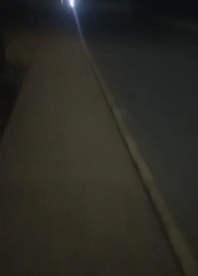 The video depicts a person walking on a street at night. Streetlights illuminate the scene, and the person is wearing a dark-colored long-sleeved shirt. A voice in the background says "Sir, you got a broken tail light there." The person responds with "Drek".
