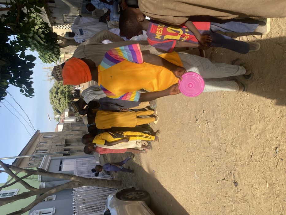 An outdoor scene in Dorayi, Nigeria, depicts a gathering of individuals on an unpaved, dusty residential street under a clear blue sky. The ground exhibits numerous footprints and tire marks, with strong shadows indicating daytime. In the immediate foreground, facing away from the camera, is a young male wearing an orange knit cap, a yellow short-sleeved shirt with rainbow-striped raglan sleeves, light grey patterned trousers, and brown slip-on shoes. He holds a bright pink frisbee-like disc behind his back with both hands. To his right, a younger male is partially visible, wearing a red and blue striped soccer jersey with "MESSi 10" printed on the back, dark blue trousers, and light brown slip-on shoes. In the midground, a cluster of approximately 8-10 children, predominantly male, are gathered, appearing to form a loose queue or group. Several children are dressed in yellow traditional-style garments and sandals, while others wear modern clothing, including one in a red top and another in a dark top. Among them are at least two adult males in light-colored traditional garments and caps, interacting with the children. Further to the right, additional adult males in similar traditional attire are seated or standing. To the far left, a silver sedan is partially visible, parked adjacent to a white fence. Behind the fence is a light green two-story building with white window frames and a white gate. Beyond the immediate cluster, a faded multi-story building stands on the left. Overhead power lines traverse the scene. In the background, a lone individual in white clothing walks along the street, and various other residential structures are visible. Trees with sparse foliage are present on the left, with denser foliage further right.