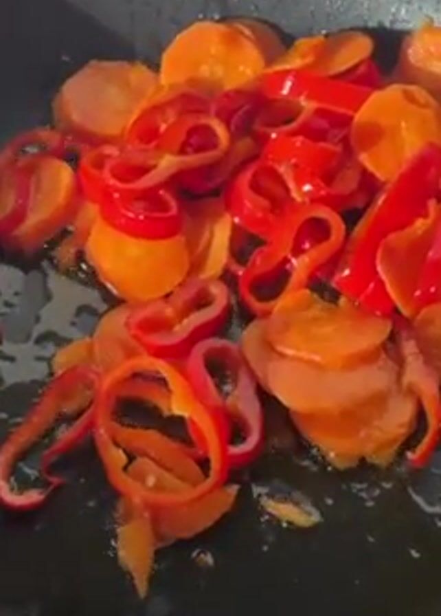 - "In a close-up shot, a black frying pan on a stovetop contains sliced carrots and red bell peppers sauteing in oil" by FM-a2gYy1, licensed under CC BY 4.0