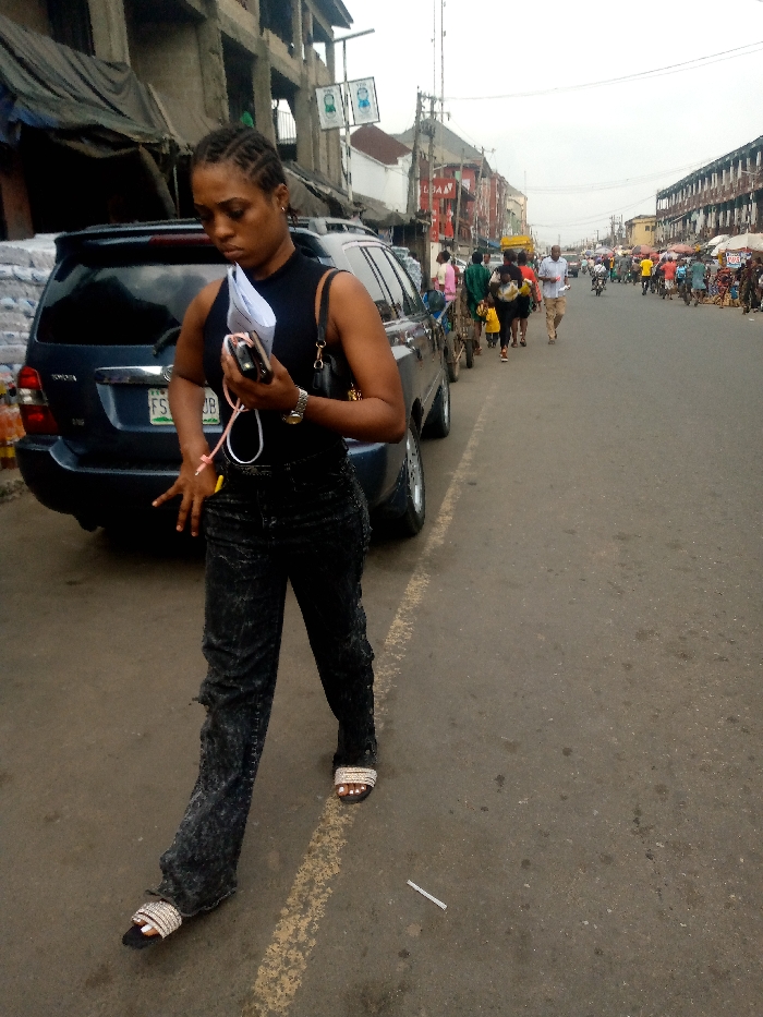 The image captures an active urban street scene in Aba, Nigeria, under an overcast sky. In the foreground, a woman of apparent African ethnicity is walking forward on an asphalt road, slightly angled towards the viewer's left. She is dressed in a black sleeveless top, distressed dark jeans, and sandals with decorative metallic straps. Her right hand holds a folded white paper, a black smartphone, and a small black handbag with a gold chain strap; a pink wrist strap is also visible. A dark blue Toyota SUV, bearing a Nigerian license plate 'FS 300 UB', is parked directly behind her on the left side of the road, partially obscured by stacks of white sacks. Further down the street, on the left, several multi-story buildings with visible concrete structures are present, some covered with dark tarpaulins. Two white rectangular signs featuring green stylized figures are attached to a utility pole in front of these buildings. The mid-ground and background depict a busy thoroughfare with numerous pedestrians moving in various directions, some pushing handcarts. Vehicles, including cars and motorcycles, are also visible. On the right side of the street, multiple market stalls or shops line the road, with people congregating around them. The asphalt road surface exhibits some wear, and a faded yellow line is visible near the foreground subject's feet, alongside a piece of white debris.