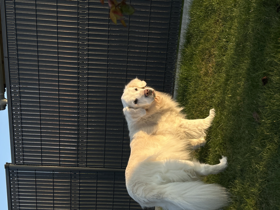 - "The scene depicts a large, cream-colored, long-haired dog, resembling a Golden Retriever, standing on green grass in a garden within Truchtersheim, France" by FM-dAK2v2, licensed under CC BY 4.0