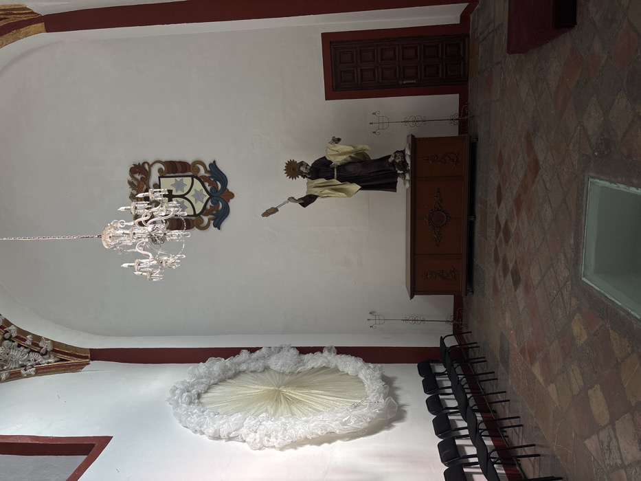 This image depicts the interior of a historic building, likely a former religious structure now serving as an exhibition space, located in the city of Puebla, Mexico. The scene presents a high-ceilinged room with white walls and prominent dark red architectural trim outlining arches and corners. In the upper left, carved, possibly gilded, decorative elements are visible on an arch. A multi-tiered crystal chandelier hangs from the ceiling in the central upper portion of the frame. Below the chandelier, a decorative wooden coat of arms featuring a shield with two grey six-pointed stars on a light field, framed by brown and blue sections, is mounted on the wall. To the left, a large, vertically oriented, oval-shaped art installation made of layered, ruffled white and translucent fabric is affixed to the wall. Below this installation, a row of six black, stackable chairs is neatly aligned against the wall. In the center-right, a dark wooden credenza or cabinet with ornate carved panels supports a statue of a male figure. The figure wears a dark robe and a lighter, possibly tan, tunic, with a halo or sunburst behind his head. He is depicted holding a staff-like object raised in his right hand. Two dark wrought-iron stands, resembling candle holders without candles, flank the credenza. A dark brown, paneled wooden door is situated in the far right corner of the room. The floor is covered with an irregular pattern of reddish-brown and lighter-toned terracotta-style tiles. In the immediate foreground, a rectangular glass panel is set into the floor, revealing a dark, ambiguous space beneath. No people are present in the scene.