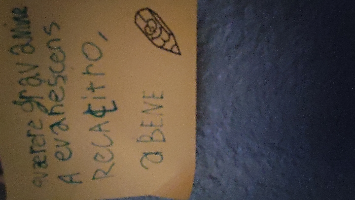 A handwritten note on a light yellow paper features green ink. The text reads: "værere grav Amine A eva rescens RCA+itro. a BEVE" with a drawn pencil cartoon above the "a BEVE" text. The paper is laying on a textured dark blue surface.