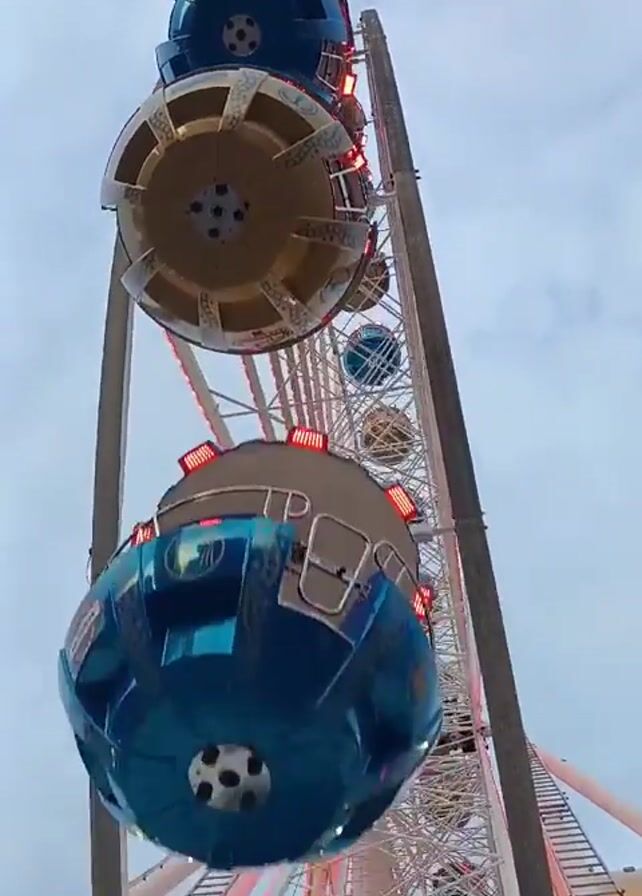 giant Ferris wheel with blue and beige cabins. The camera angle is looking up at the wheel. The Ferris wheel appears to be in operation, slowly rotating. It is daytime with a cloudy sky. Some red lights can be seen on the cabins and the wheel structure.