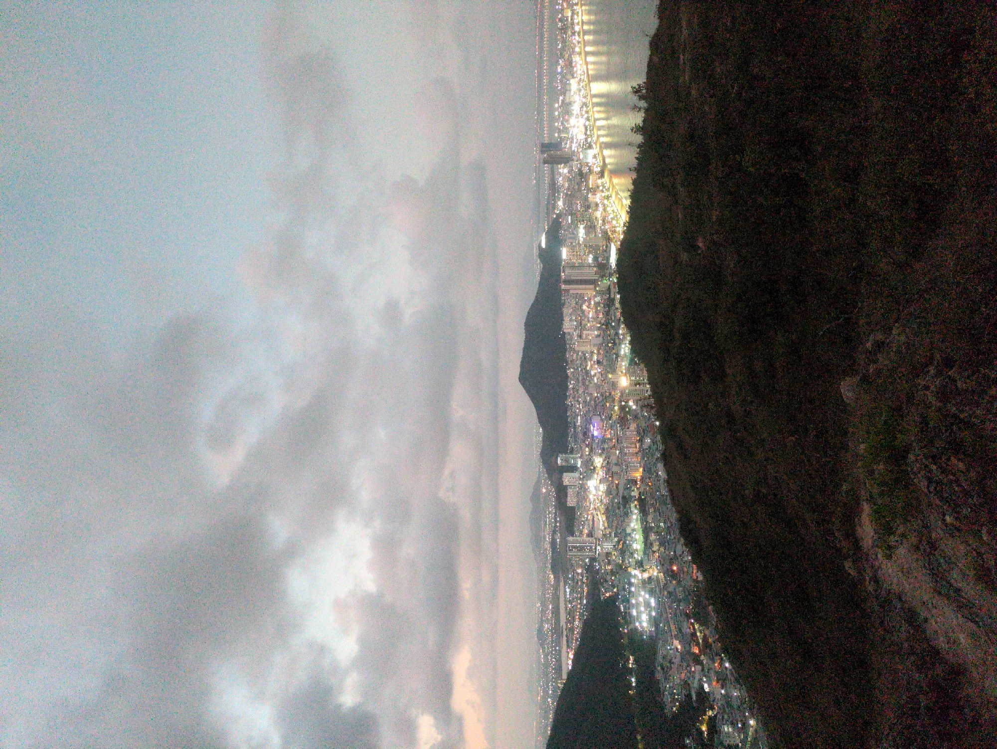 An elevated, panoramic view depicts the city of South Quy Nhon Ward, Vietnam, at dusk or early night. The foreground consists of a dark, sparsely vegetated hillside. The midground features a brightly illuminated urban landscape extending along a curving coastline. Numerous buildings, including several tall high-rise structures, are visible with their interior and exterior lights active. The city's lights are reflected on the calm surface of an adjacent body of water, likely a bay or the ocean, on the right side of the image. A distinct, illuminated strip along the waterfront suggests a promenade or major road. Dark hills and mountains frame the city in the background, with one prominent peak centrally located. Distant city lights and a linear arrangement of lights, possibly from a bridge or causeway, are discernible on the far horizon across the water. The sky above is overcast with multiple layers of gray clouds. No individual people or specific actions are discernible. The overall environment is a coastal city nestled between hills under twilight conditions.