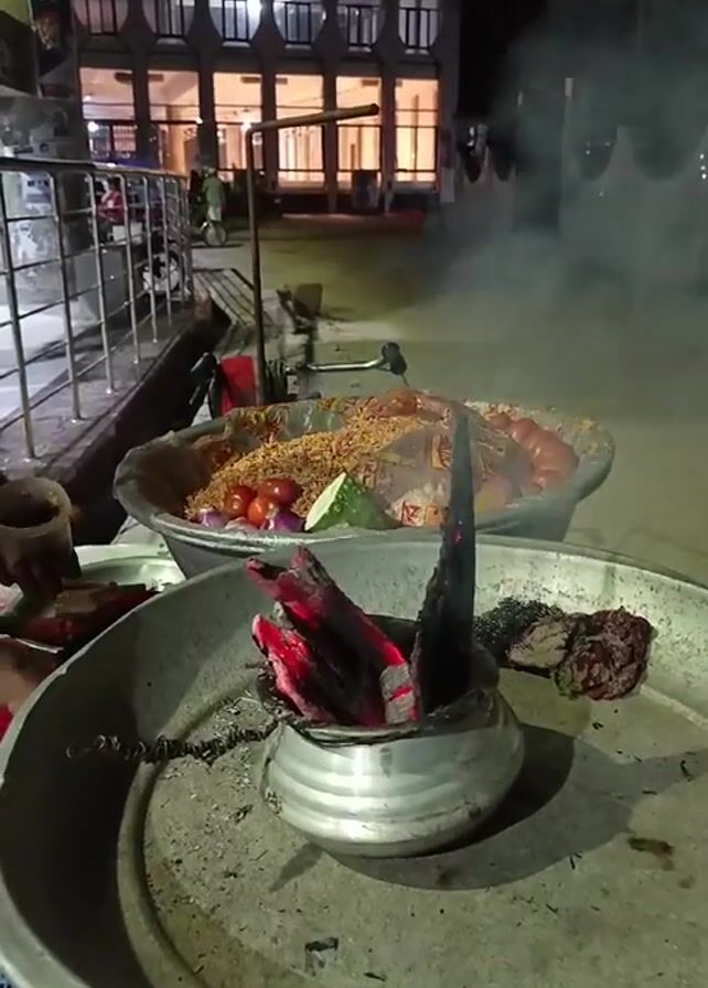 street food vendor preparing food at night. The vendor is standing behind a table laden with ingredients including tomatoes, onions, and noodles. He is pouring something from a plastic cup into a small dish. In the foreground, a small charcoal fire burns in a metal container. A building with multiple arched windows can be seen in the background. The scene is illuminated by streetlights. The air is hazy with smoke.