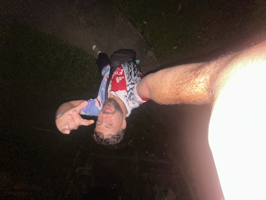 An outdoor night scene in the city of Pai, Thailand, illuminated by a camera flash. A male subject is positioned off-center, angled towards the camera, smiling directly at the lens. He has short, curly dark hair and a beard, and is wearing a multi-colored shirt featuring white, red, black, and blue patterns, including "ADIDAS" and "Emirates" branding. A black fanny pack or cross-body bag is slung across his chest. His right arm is raised, with his hand forming a distinctive gesture. A bracelet is visible on his right wrist. He wears dark trousers and a white sock on his visible left foot. The arm of the individual taking the photograph, covered in hair and brightly lit by the flash, occupies the lower foreground. The immediate environment includes a dark concrete or paved surface to the subject's right and dimly lit green foliage or grass in the background, suggesting an outdoor setting at night.