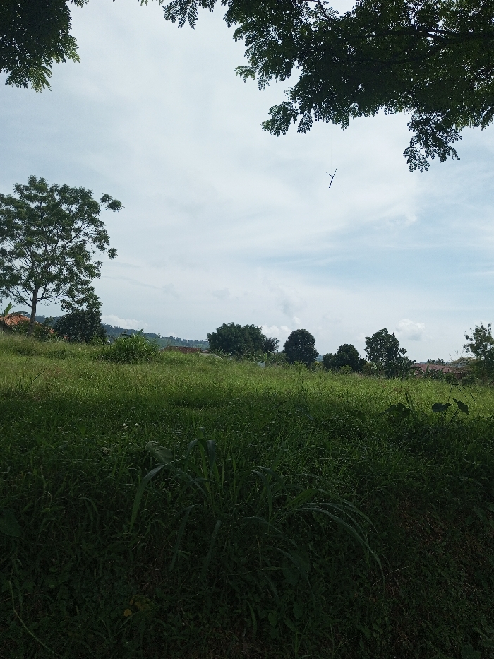 The image depicts an outdoor scene within the city of Namthoung, Laos, characterized by a sloping terrain covered in dense, tall green grass and various herbaceous plants. The foreground is darker, suggesting shade or lower light, while the midground is brighter. Several mature trees with full green canopies are scattered across the midground and left side. In the distance, on slightly elevated ground to the left and right, faint structures, possibly houses with reddish-brown roofs, are discernible, indicating a residential or semi-urban environment. The sky above is largely overcast with white and light gray clouds. Dark green foliage from unseen trees frames the top left and top right corners of the view. A slender, dark, Y-shaped object, suspended by a thin, indiscernible line, is visible against the sky in the upper right quadrant of the frame. No individuals, explicit actions, or direct interactions are visible.