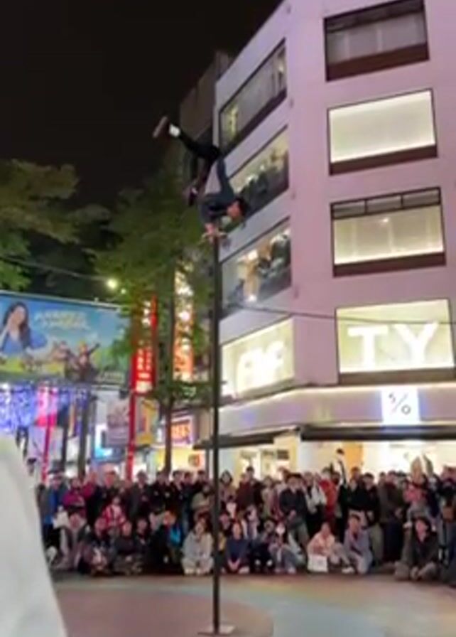 In a nighttime outdoor setting, a slender dark-haired man in dark pants, a white shirt, and a gray vest is performing a handstand on a small circular metal disc affixed to the top of a vertical metal pole. The man initially inverts himself onto the disc, then extends his legs vertically. The pole is positioned in a public square in front of a multi-story building. A large crowd of onlookers surrounds the pole, some sitting on the ground and some standing. The video appears to be shot from the perspective of someone within the crowd, slightly off-center to the left. To the left of the pole is a brightly lit billboard. The building behind the pole is lit, and the logo “AF” is visible on the first story. A tree with green leaves is also partially visible. Music plays in the background.