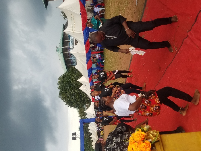 The image depicts an outdoor cultural event or celebration in the city of Alor, Nigeria, under a heavily overcast sky