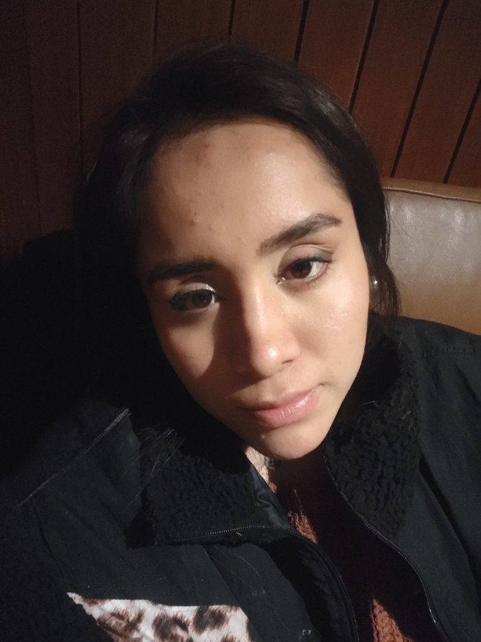 A close-up, slightly high-angle portrait shows an adult female indoors. The background features dark vertical wood paneling on the left and a light brown upholstered surface on the right, indicative of a commercial establishment such as a restaurant or cafe. The provided context specifies the location as Wanchaq, Peru. The female subject has dark hair, brown eyes, and light to medium skin with minor blemishes visible on her forehead. She is wearing eye makeup, including eyeliner and what appears to be lip gloss. A small, light-colored stud earring is present in her right earlobe. She is dressed in a black outer garment, possibly a jacket or vest, featuring a textured, dark collar. A reddish-brown undergarment is partially visible beneath the outer layer, and a white and brown leopard print pattern is visible on the lower left section of her black garment. The lighting source appears to be from the subject's front-right, illuminating her face and casting shadows on the left side of her face and the adjacent background. Her expression is neutral, and she is looking directly or slightly off-camera. No other individuals or specific actions are discernible.