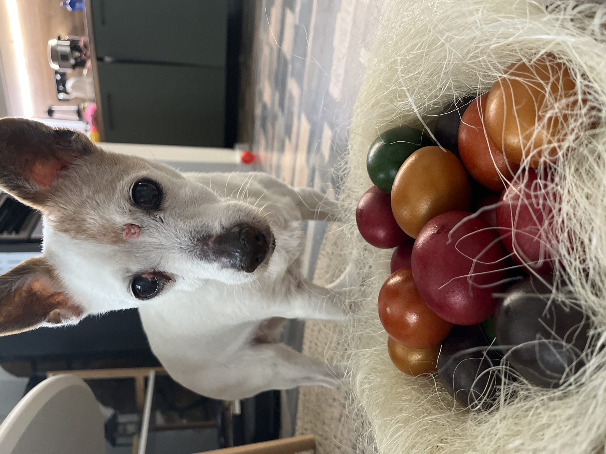 A small, white and tan dog with a black nose and visible mole on its forehead looks towards the camera, standing next to a basket-like object filled with smooth, colorful, egg-shaped objects