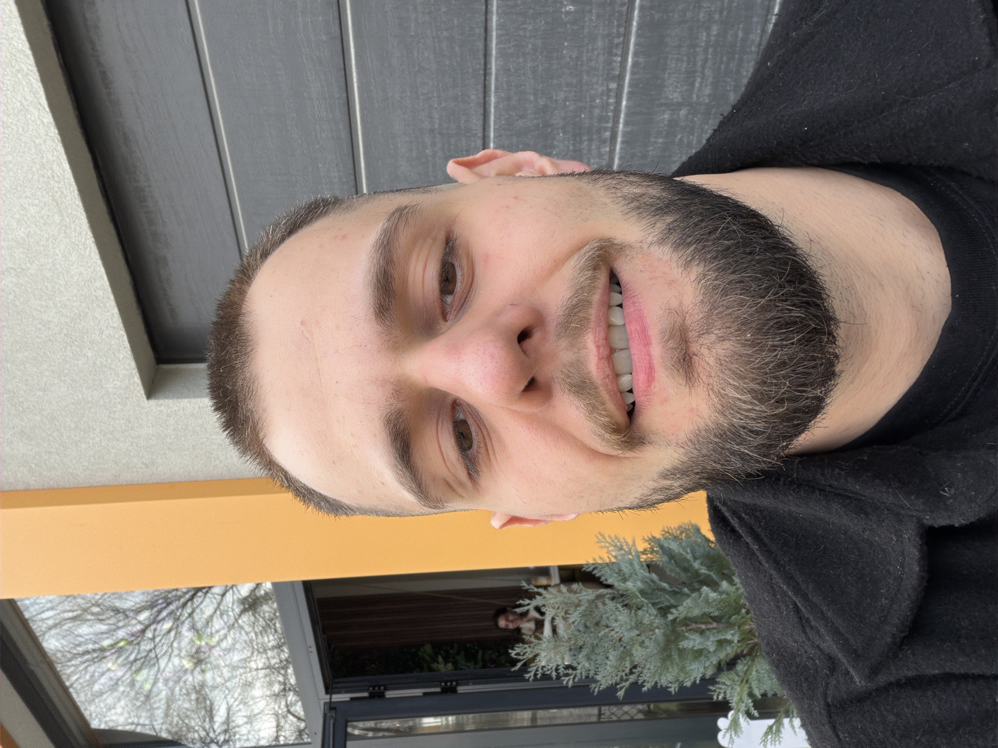 A male individual with short brown hair and a full beard occupies the central foreground, captured in a close-up, selfie-style shot. He is looking directly at the camera with a slight smile, revealing his upper teeth. He wears a dark, possibly black, collared jacket over a dark shirt. The scene is set in Plovdiv, Bulgaria. To the subject's left, an open glass door or window reveals the interior of an establishment, where a blurry female figure with dark hair is seated at a table, smiling towards the camera. An evergreen plant is positioned between the subject and the establishment's entrance. A vertical orange pillar separates the glass entrance from an adjacent light-colored textured wall. Reflected in the glass are bare tree branches against a bright sky. To the subject's right, a grey, horizontally paneled surface, possibly a garage door or architectural element, extends upwards. Above this grey surface, a light-colored textured wall is visible.