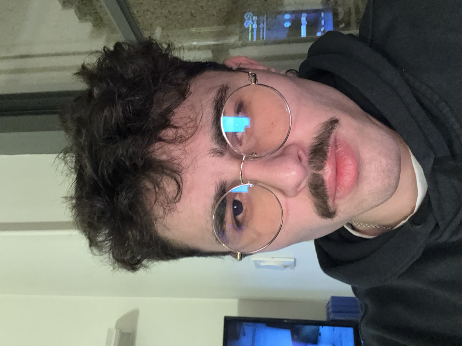 A young man with curly dark hair and round glasses poses