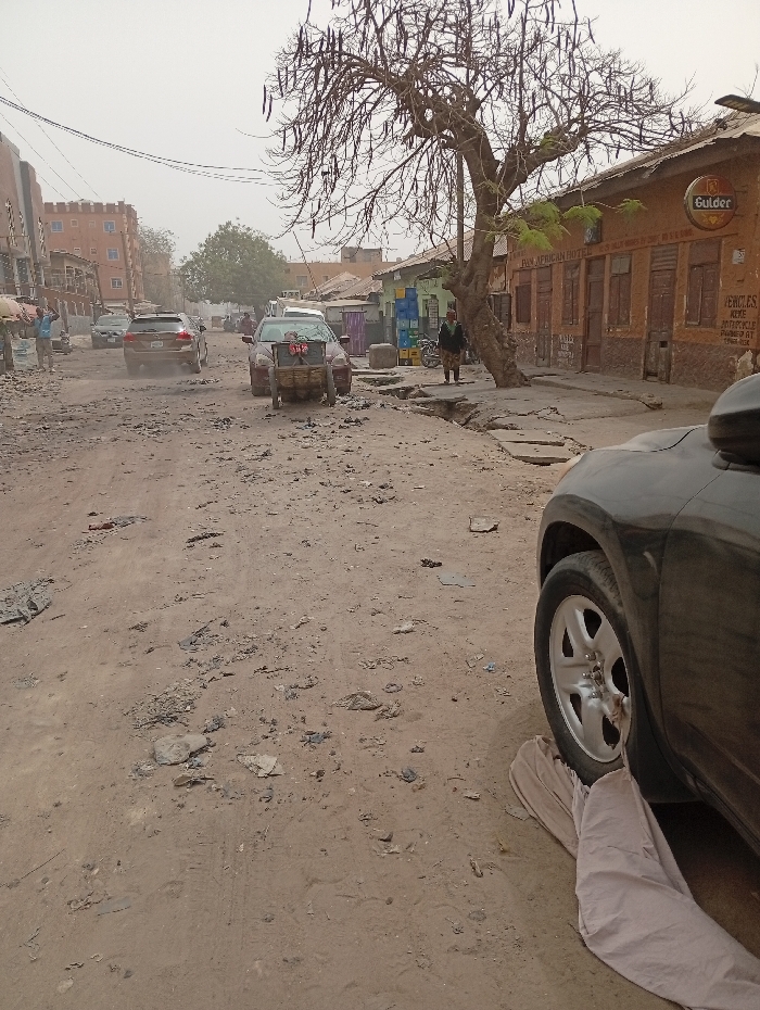 The image depicts an unpaved, dusty street scene in Sabon Gari West, Nigeria, under an overcast or hazy sky