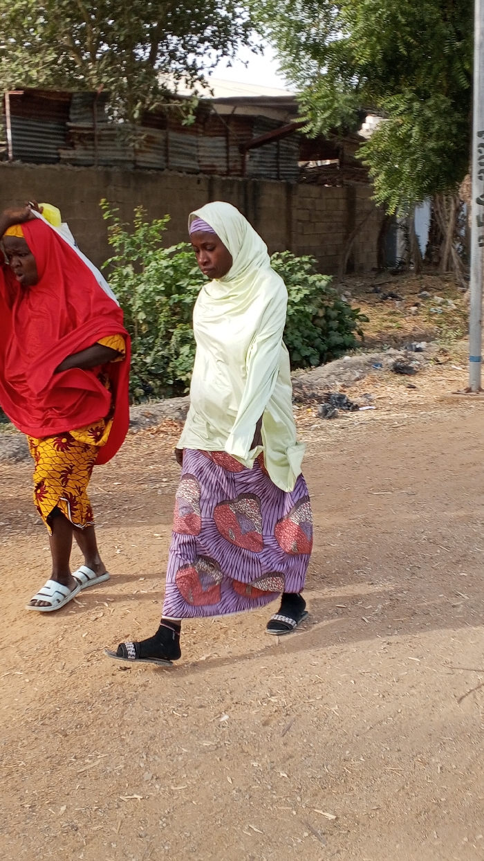 Two adult females walk from right to left on an unpaved dirt path in Dakata, Nigeria