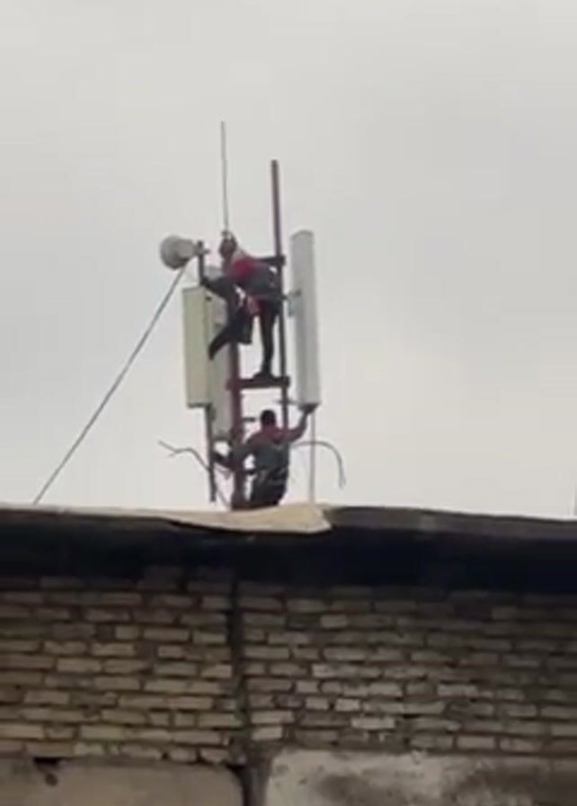 two people working on a cell tower on the roof of a building
