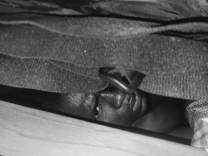 A close-up, monochrome shot shows a person lying down with a denim-like material above their head. The person's face is visible, with a shoe partially obscuring the forehead. The eye is open and glistening. The skin appears damp. The person is laying down. A portion of a patterned fabric is visible near the bottom right.