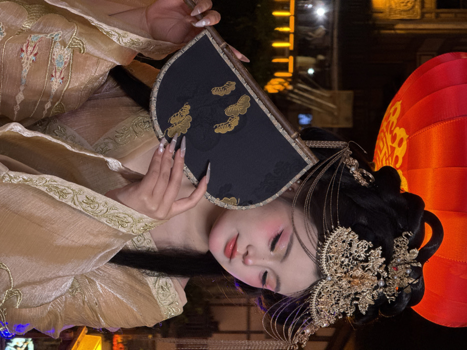 A young East Asian woman is depicted in a medium shot, against a dark, illuminated background at night, in what appears to be a cultural or historic area within Yuzhong District, China. She is positioned centrally, gazing downwards with a contemplative expression. Her hair is styled in an elaborate black updo, adorned with an ornate, multi-layered golden headdress featuring intricate filigree and delicate dangling chains, possibly with small red accents. She wears traditional Chinese attire, specifically a light golden-beige hanfu-style garment made of a shimmering fabric, embellished with detailed gold embroidery along the collar and sleeves. Both hands delicately hold a semi-circular black fan with a visible wooden or bamboo handle. The fan's surface is embroidered with golden cloud or foliage motifs. Her nails are long, manicured, and have a light-colored, possibly iridescent finish. Prominent pink blush and eyeshadow are applied to her cheeks and eyelids, complementing her light pink lips. In the upper left background, a large, round, bright red Chinese lantern with golden characters is partially visible, providing a dominant warm light source. Blurred architectural elements, illuminated by yellow lights, are present in the dark background, consistent with a traditional street or building complex. The scene suggests a posed portrait in a culturally themed nocturnal environment.