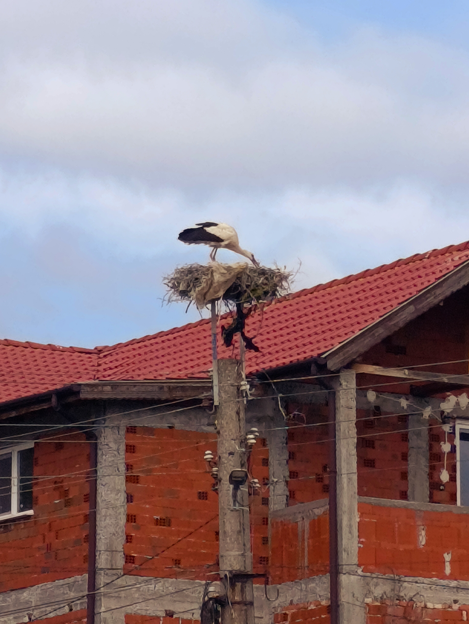 A white stork stands in a large nest atop a utility pole in Shiroko pole, Bulgaria. The nest is constructed of sticks, branches, and debris. The pole also carries electrical wires and ceramic insulators. Behind the pole is a two-story brick building with a red tile roof and visible windows. The sky is overcast with light blue patches.