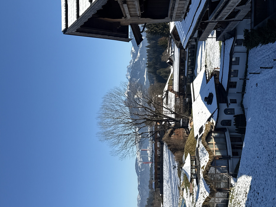 The image depicts a snow-covered alpine landscape in Going am Wilden Kaiser, Austria, under a clear, unclouded blue sky. In the immediate foreground to the right, a section of a multi-story traditional wooden building with a dark, snow-dusted gabled roof and ornate carved wooden balconies is visible. The midground features a cluster of buildings partially covered in snow. A prominent structure exhibits a curved facade with extensive glazing, a textured, possibly grass-covered or thatched roof, and is partially set into a snowy slope. Adjacent are white-walled buildings with dark, snow-covered roofs. A small, white hexagonal gazebo with a dark conical roof topped by a weathervane is situated in the lower-left midground. A large, bare deciduous tree stands centrally, its branches reaching towards the sky. The ground throughout the scene is covered in a layer of white snow, with some patches of brown vegetation visible. In the background, a large, elongated building with multiple snow-covered sections extends horizontally on a distant snowy incline. Further in the distance, a dense coniferous forest line transitions to rugged, snow-capped mountains of the Wilder Kaiser range. On the distant left horizon, behind the elongated building, three tall, red-and-white striped industrial chimneys rise prominently. The scene is illuminated by bright sunlight, casting distinct shadows. No individuals or animate subjects are present.