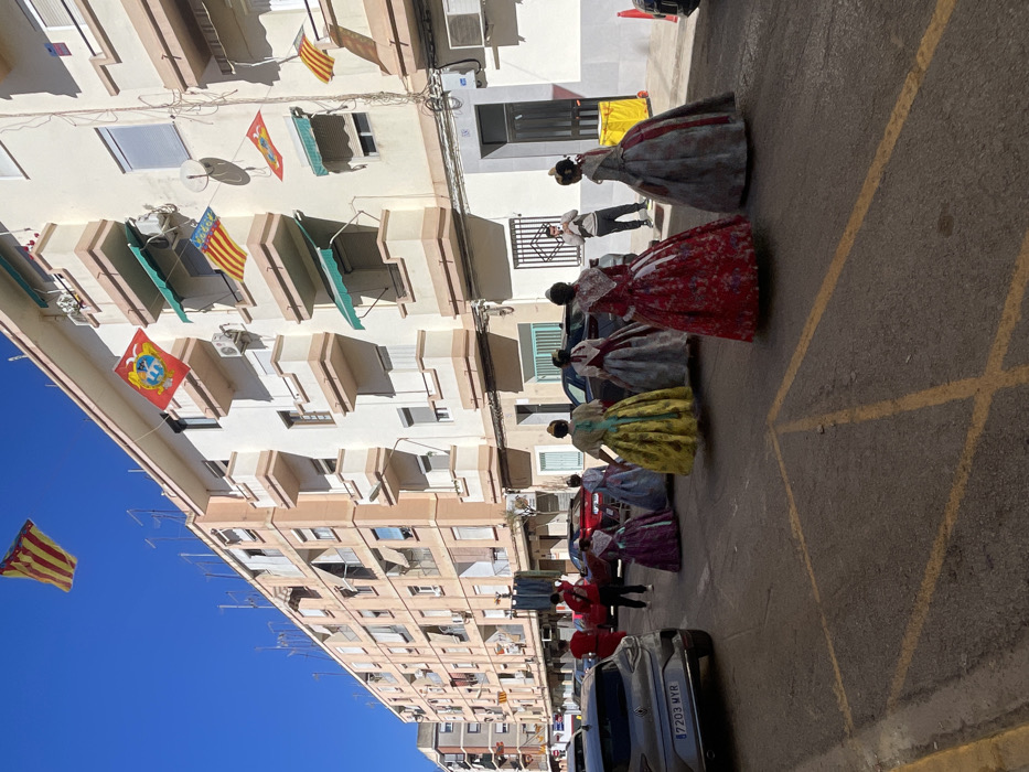 The image captures a street scene in Paiporta, Spain, under a clear blue sky. In the foreground, six individuals, primarily women or girls, walk away from the viewer on an asphalt street marked with yellow lines. They are attired in elaborate, full-skirted traditional Valencian Fallera dresses; colors include red floral, yellow floral, purple floral, and patterned grey/silver. Their hair is styled in traditional buns. On the right side of the street, a man in a light grey hoodie and dark pants stands on the sidewalk, holding a smartphone horizontally, appearing to record the procession. A yellow utility box and a partial orange traffic cone are visible near him. The right side of the street is lined by a multi-story residential building, light-colored with beige trim, featuring multiple balconies, some equipped with green awnings. Numerous flags are displayed: several red and yellow striped Valencian Senyeras are strung between buildings and attached to balconies, along with flags incorporating the Valencian coat of arms. A large Valencian flag is suspended high above the street. On the left side of the street, a grey Renault Clio (license plate 7203 MYR) is parked. Further down the street, two individuals in red shirts are visible near other parked vehicles. The background on the left features another multi-story residential building, peach-toned. The scene is brightly lit by sunlight, casting distinct shadows.