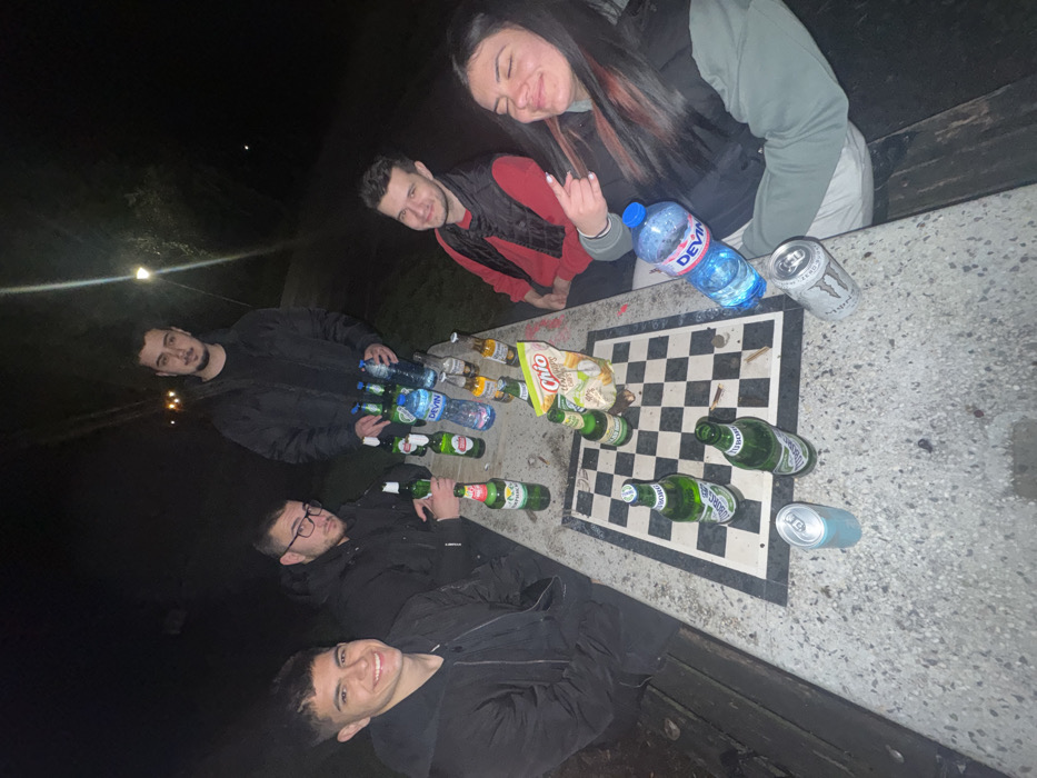 Five individuals, comprising four males and one female, are positioned around a grey concrete picnic table at night in an outdoor public park or recreational area within Plovdiv, Bulgaria. The table's surface features an integrated black and white chessboard pattern. Artificial lighting illuminates the immediate scene, with distant ambient lights visible in the dark, blurred background of trees and foliage. From left to right, the seated individuals are: 1. A male with short dark hair, wearing a dark jacket, smiling and looking towards the camera. 2. A male wearing glasses, a dark jacket, and light stubble, holding a green beer bottle and looking towards the camera. 3. A male with dark hair and a light beard, wearing a dark puffer jacket, standing behind the table and looking towards the camera. 4. A male with short dark hair, wearing a red long-sleeved shirt and a dark vest, smiling and looking towards the camera. 5. A female with long dark hair, wearing a light green sweatshirt and a dark vest, with her eyes closed in a smile, extending her right index finger. The table is occupied by numerous beverage containers and a snack bag. These include multiple green glass beer bottles (some identified as Tuborg, one as Stella Artois), clear plastic water bottles (Devin brand), clear glass bottles resembling Corona Extra, a silver Monster Energy Zero Sugar can, and a light blue aluminum can. A bag of Chio Paprika flavored chips is positioned near the center of the table. Small debris, consistent with litter, is scattered across the chessboard area.