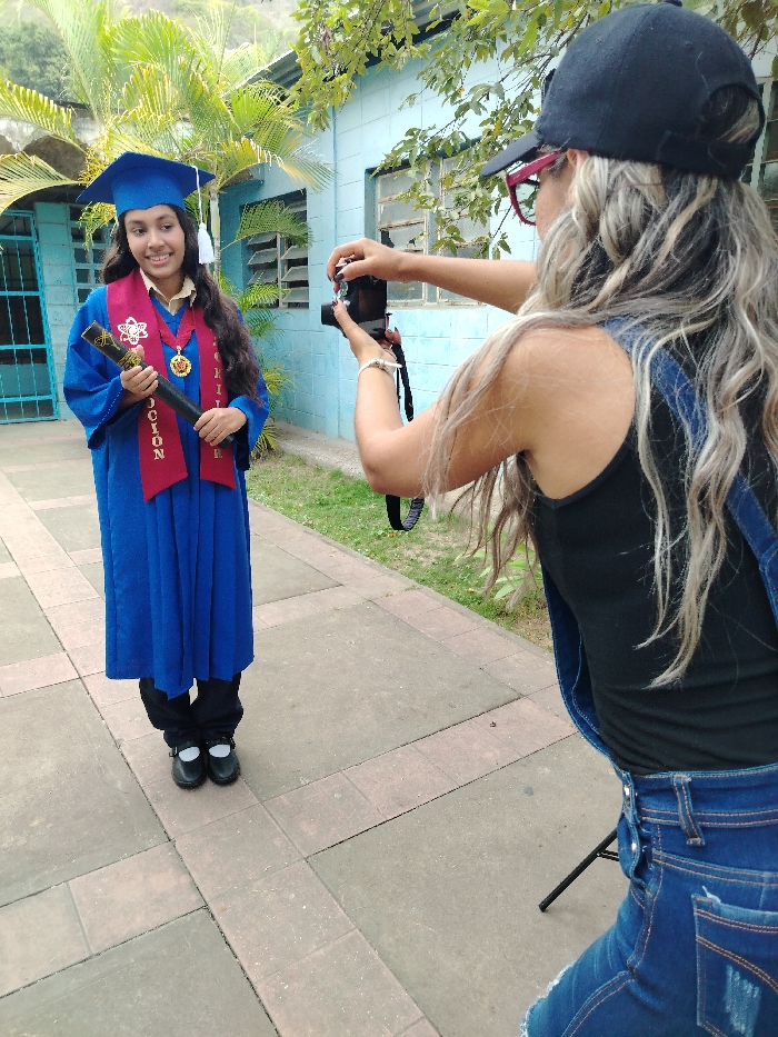 The image depicts two females outdoors in Las Tejerías, Venezuela. A young female, identified as the subject, stands on the left side of the frame, facing the photographer with a slight smile. She wears a royal blue graduation gown and a matching cap with a white tassel. Over the gown, she has a red stole with gold trim, featuring an emblem resembling an atom on the left and the word "PROMOCION" (Spanish for "promotion" or "graduation class") written vertically. A gold medal with a red center is suspended around her neck. She holds a black, tubular scroll case, presumably containing a diploma, with both hands. Her long, dark, wavy hair extends over her shoulders. She wears black trousers and black Mary Jane-style shoes. On the right side, a second female, acting as the photographer, is captured from a rear-right perspective, facing the subject. She has long, wavy, blonde hair and wears a black baseball cap, red-framed eyeglasses, a black tank top, and a blue denim sleeveless top or overall. She is holding a black digital camera with both hands, aiming it at the subject. A black tripod leg is partially visible on the ground near her. The background features a light blue building with horizontal louvered windows. Green palm trees and other green foliage are visible behind the building and to the left. A distant hillside or mountain range is present in the far background. The scene takes place on a paved walkway constructed from rectangular concrete pavers of varying gray and reddish-brown hues, forming a grid pattern. A strip of green grass and dirt borders the walkway on the right.