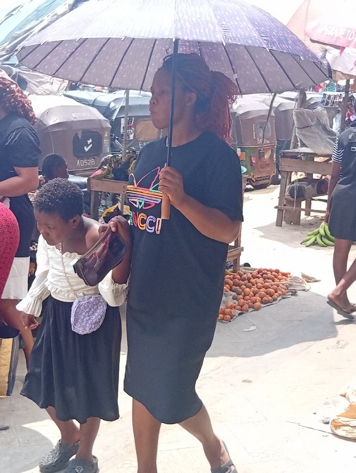 The image depicts a busy outdoor market scene in Ura Nta Umuarandu, Nigeria. In the foreground, a woman and a child walk from left to right. The woman, positioned slightly ahead and to the right, has medium-dark skin and reddish-brown braided hair styled in a ponytail. She wears a black short-sleeved dress featuring a colorful "GUCCI" logo on the chest and carries a light purple/grey polka-dotted umbrella with a wooden handle in her right hand, providing shade. She wears dark sandals. To her left and slightly behind is a child, a girl with short dark curly hair and medium-dark skin. She wears a white long-sleeved blouse with ruffled cuffs, a black skirt, and grey Crocs-style shoes. The child holds a small, translucent dark-colored purse with a gold chain strap in her right hand and has a small, round, purple patterned bag with a chain strap slung across her body. The background reveals a bustling market environment. To the right, a pile of small orange-red fruits, possibly garden eggs, is displayed on a light-colored cloth directly on the ground. Behind this, a wooden market stall supports green bananas. Another person, partially visible, walks away in the far right. In the mid-ground and left, several three-wheeled auto-rickshaws (Keke Napep) are parked or moving, some bearing license-like numbers such as "AD528" and text like "ASTORY". Other market stalls, shaded areas from canopies, and blurred figures of additional people are visible, indicating a crowded setting under bright daylight. The ground appears to be a mix of concrete and dirt.