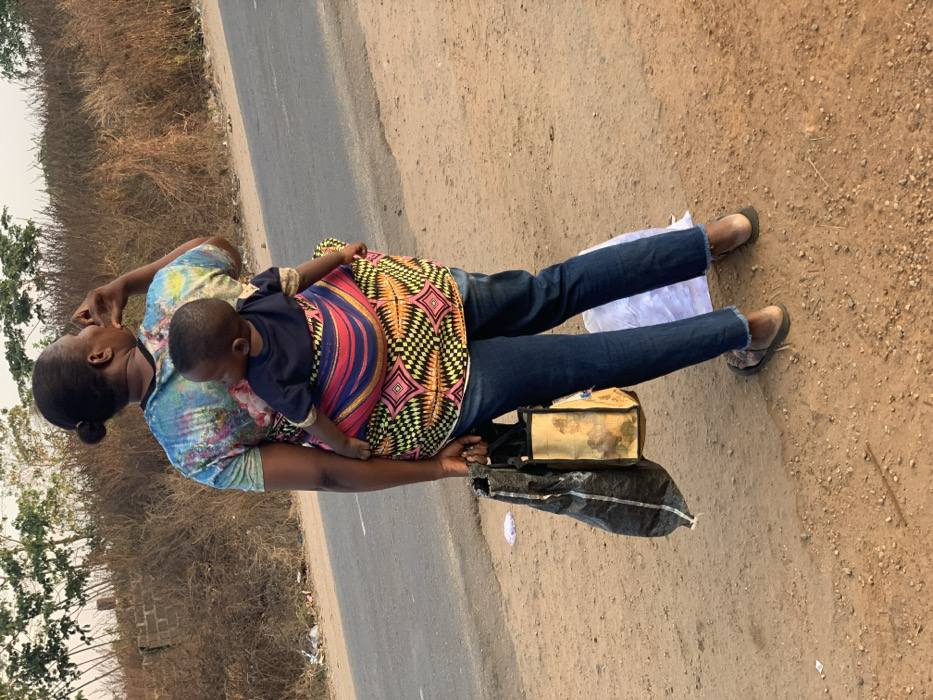 - "A woman stands on a road's edge, holding a child secured on her back with a brightly patterned cloth" by FM-JIEGo1, licensed under CC BY 4.0