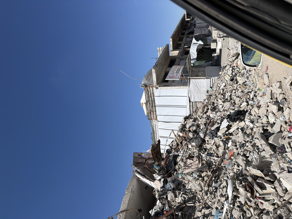 This image captures a scene in Jabalia, Palestinian Territory, depicting extensive urban damage under a clear blue sky. A large pile of concrete rubble, broken masonry, and twisted rebar dominates the left and central foreground, extending towards the right. Interspersed within this debris are various items, including dark and light-colored plastic bags and fabric scraps. To the right of the rubble, a multi-story building stands, showing signs of significant structural damage. Its lower facade is partially covered with white, vertically striped tarpaulin or sheeting. The upper sections of the building reveal exposed concrete and rebar, indicating partial collapse or heavy damage. A red and white sign, featuring Arabic text and a circular logo, is attached to a pole near an entrance at the building's ground level. This entrance area is further obscured by draped white canvas material. A thin, light-colored antenna or rod extends upwards from the building's roof. On the far right, a portion of a yellow vehicle's interior door frame and its exterior side mirror are visible; the mirror displays a crack and a distorted reflection. No individuals are present in the scene.