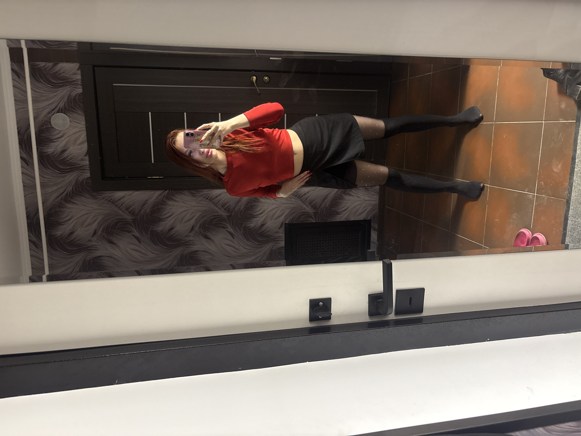 A person is taking a mirror selfie indoors. The person has red hair and is wearing a red long-sleeved shirt, a black skirt, and black tights with a polka dot pattern. They are holding a pink cell phone in their right hand, presumably to take the picture. The reflection shows a brown tiled floor with pink flip-flops near the door. There is a dark brown door and gray patterned wallpaper on the wall in the reflection. Below the mirror, there is a white surface with black hardware. The location is not identifiable from the image. The city of Simferopol, Ukraine cannot be determined.