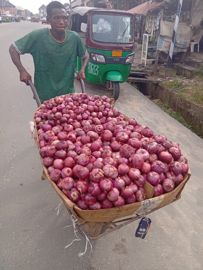 In the city of Umuode, Nigeria, a young man of dark complexion stands on a paved road, pushing a wheelbarrow overflowing with hundreds of red onions