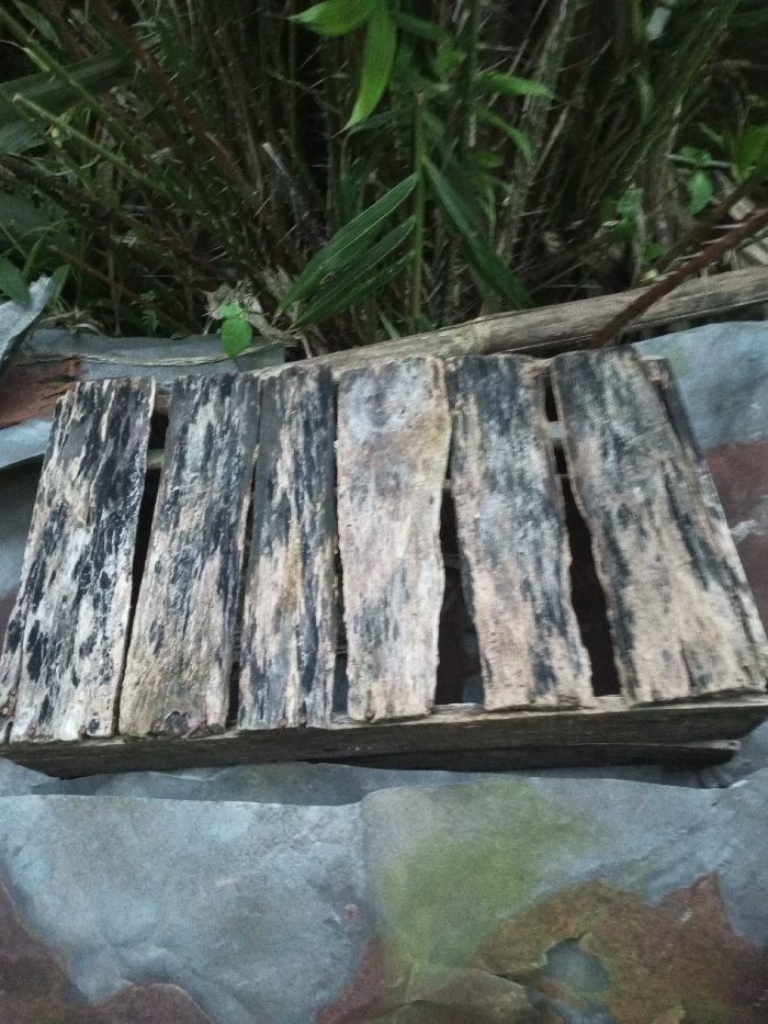 This image depicts an outdoor scene in the city of Ivato, Madagascar. In the foreground, a rectangular object constructed from six weathered wooden slats is positioned, exhibiting discoloration in shades of grey, black, and brown. Irregular vertical gaps are visible between the slats. This wooden structure rests upon a sheet of textured material, possibly aged corrugated metal, which is predominantly grey with hints of brown and green, and shows slight undulations. The background consists of dense, green foliage, including numerous thin, thorny stems and larger leaves, indicating an overgrown area. No individuals or animate subjects are present in the frame.