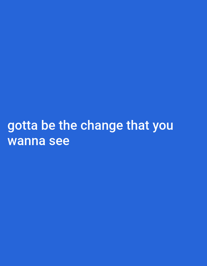 A solid blue background fills the frame. The words "gotta be the change that you wanna see" are written in white sans-serif font. The text is positioned in the lower-left quadrant, close to the bottom edge. The words appear to be centrally aligned within that area. The overall tone is simple and motivational.