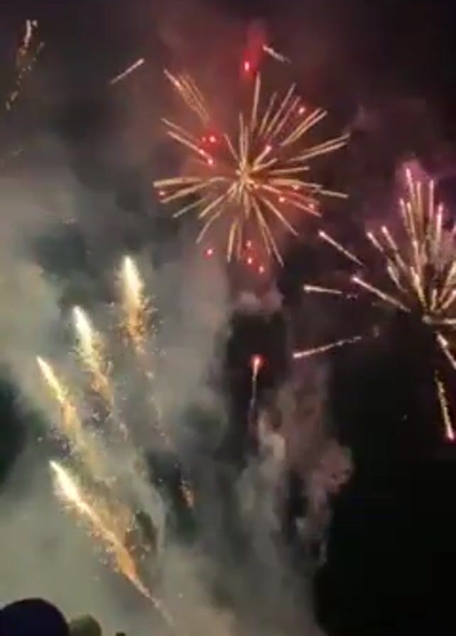 fireworks display at night. The fireworks are various colors, including gold, red, and pink, and explode in the sky with a loud noise. There is a lot of smoke from the fireworks. In the foreground, there are a few people standing and watching the fireworks. Some are wearing hats, and some are holding red balloons. The sky is dark, and there are a few stars visible.