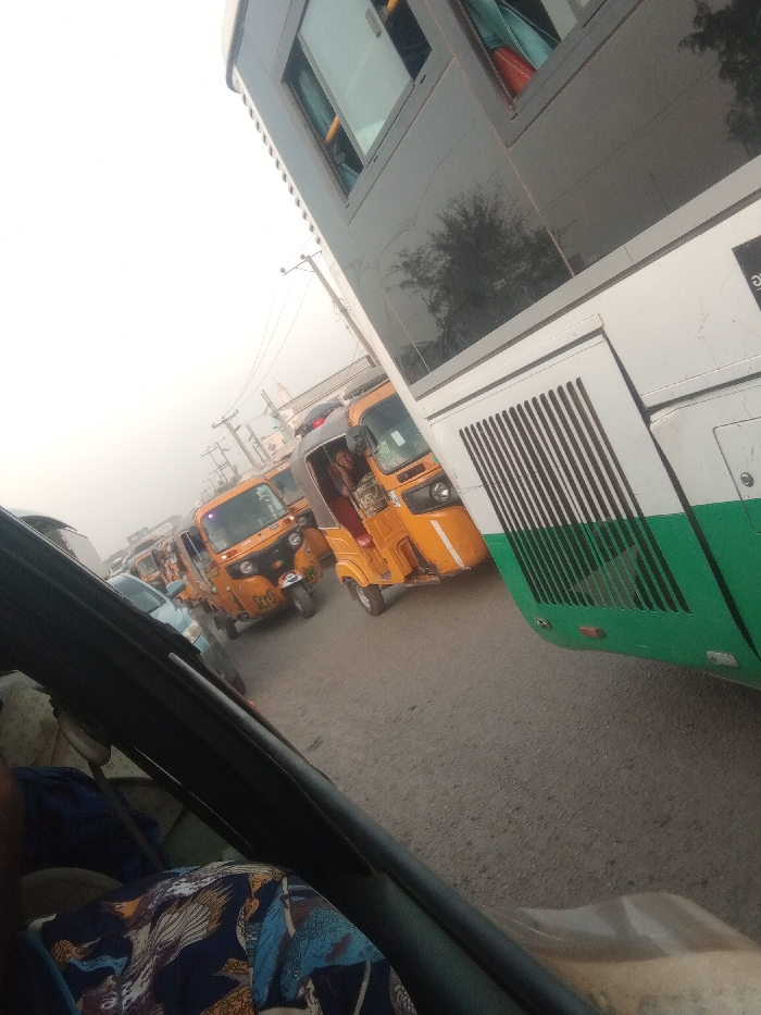 A hazy street scene shows a line of yellow auto rickshaws, or "tuk-tuks," in traffic. A large bus, predominantly white with a green stripe, partially obscures the view on the right. The perspective is from inside another vehicle, with the frame of the window and fabric-covered seat visible in the foreground. Power lines and buildings appear in the background, adding to the urban setting.