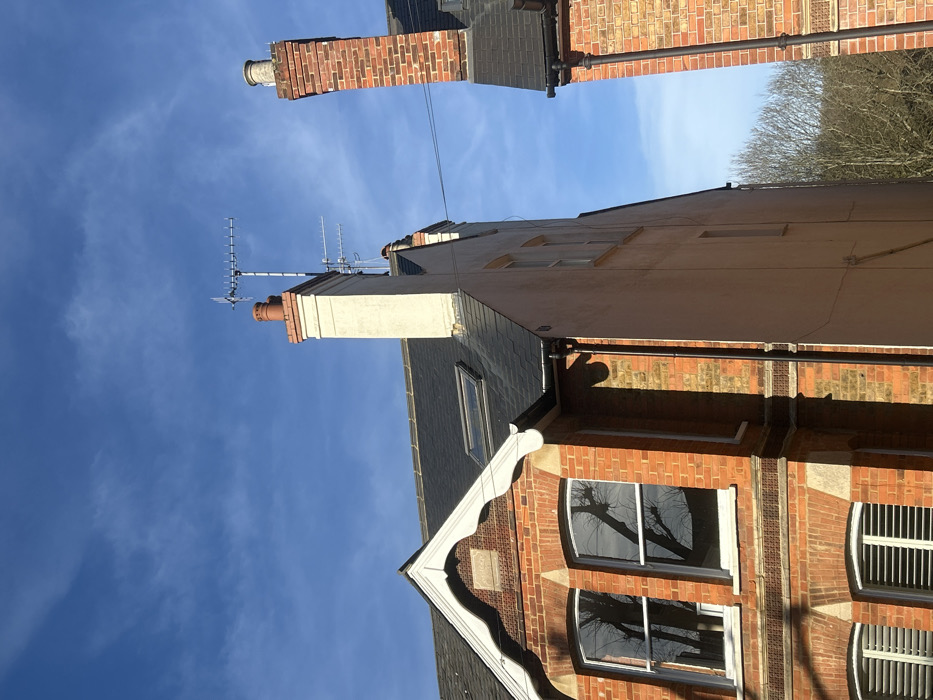 The image displays an upward view of two residential buildings, located in Dacorum, United Kingdom, under a clear blue sky with minimal wispy clouds. The primary building on the left is a red brick structure with light-colored stone or rendered decorative elements, including a gabled facade with white ornate bargeboards. Its dark slate roof features a single rectangular skylight. Two arched windows on the upper floor reflect the bare branches of a tree and the sky. A prominent cream-colored chimney, capped with a terracotta pot, extends from the roof and supports multiple Yagi-style television aerials. The visible side wall of this building is rendered in a light, neutral tone. To the right, a second red brick building is partially visible, also featuring a dark slate roof and a brick chimney topped with a lighter-colored pot. Black downspouts are visible on both structures. The scene is brightly illuminated by direct sunlight, casting distinct shadows. No people, subjects, or active interactions are present.