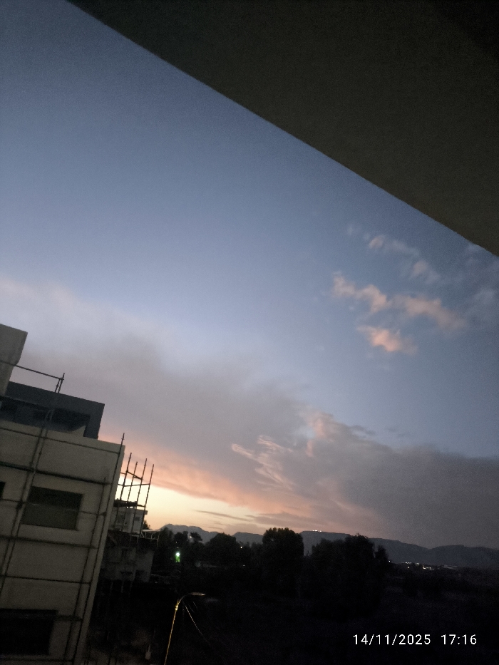 The image, captured on 14/11/2025 at 17:16, presents a twilight scene over Nicosia, Northern Cyprus / Cyprus. The sky transitions from a deep blue at the top to a prominent orange and pink at the western horizon, indicative of a sunset, with scattered clouds reflecting these colors. A dark, angled architectural element, likely a balcony ceiling or building overhang, occupies the upper third of the frame. In the left mid-ground, a multi-story building under construction is visible, featuring a light-colored facade and extensive scaffolding. The central and right mid-ground consists of dark, silhouetted trees and vegetation. A distinct green light source and several fainter, distant lights are visible within this vegetated area. The background features a silhouette of distant mountains or hills spanning the horizon, adorned with multiple clusters of small lights, indicating an urbanized or populated area. No individuals or specific human actions are depicted.