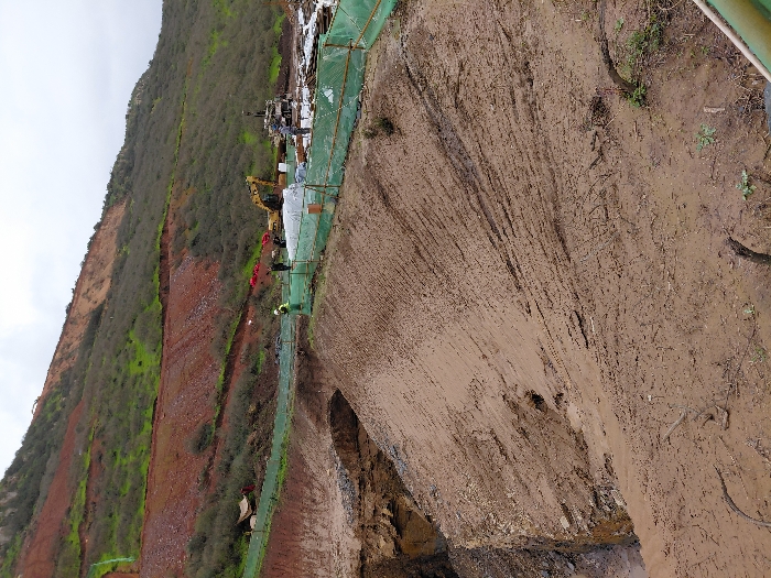 A construction site on a steep hillside. A green mesh fence runs along the contour, with construction workers and equipment visible on the narrow path. The hillside is brown and red, with some patches of green vegetation. The foreground shows disturbed muddy earth with tire tracks. The sky is overcast, indicating potentially wet conditions. The overall impression is of an active project attempting to stabilize or develop a challenging terrain.