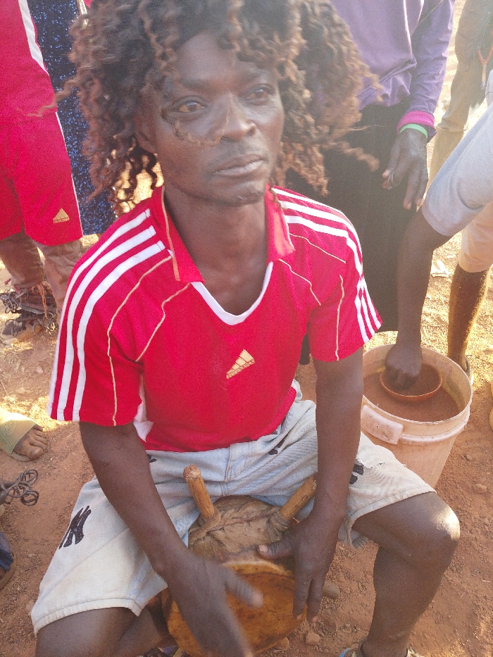 In Vodni, Nigeria, an outdoor scene depicts an adult male seated on reddish-brown ground, holding a traditional drum
