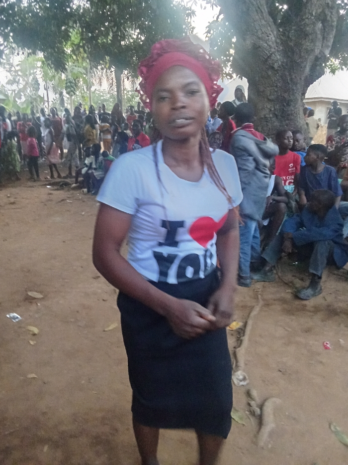 A woman stands in the foreground, wearing a red head wrap, a white t-shirt with the words "I ❤️ You", and a black skirt. Behind her, a crowd gathers under the shade of a large tree. Many children are present, some sitting on the ground. The setting appears to be an outdoor gathering in a rural area. The ground is dusty and there are trees in the background.
