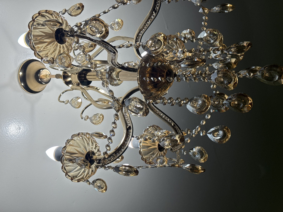- "A crystal chandelier hangs from a white ceiling, illuminated by lights in the fixture" by FM-eVA3B3, licensed under CC BY 4.0