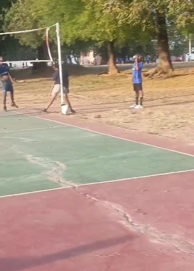 group of people cleaning and preparing a volleyball court outdoors. The court has a red and green surface, with white lines marking the boundaries. There's a volleyball net stretched across the middle of the court. Several people, dressed in casual clothing like t-shirts and shorts, are seen sweeping leaves off the court with brooms and rakes. In the background, there are tall trees and a building partially visible. Someone in a red top walks towards the camera initially, and later people are seen milling around the net.