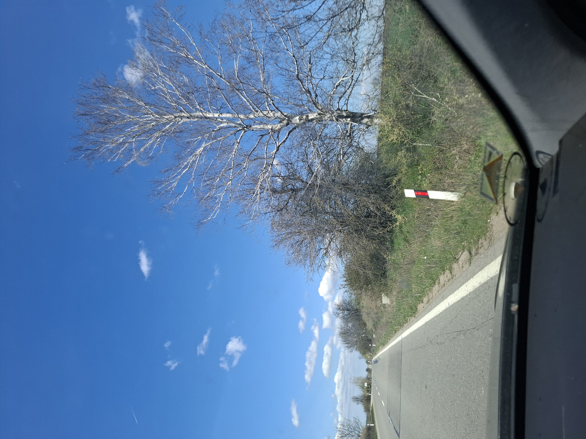 view from inside a vehicle driving on a road in the city of Smirnenski, Bulgaria. The road is paved with a white line marking the edge. To the right of the road is a grassy area with vegetation, including a tree with bare branches, possibly a birch, and a red and white striped pole. The sky is bright blue with scattered white clouds. A portion of the vehicle's interior, including the dashboard, is visible in the foreground.