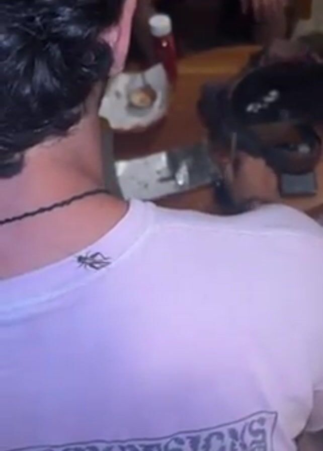 close-up view of the back of a person wearing a light purple t-shirt with the words "STUSSY DESIGNS" printed on it. A small, brown grasshopper is perched on the back of the person's t-shirt, near the neckline. The person has dark hair and is wearing a beaded necklace. In the background, there is a wooden table with various items on it, including a bottle of ketchup, a plate with food, and other objects that are partially obscured. Other people are seated around the table, but their faces are not clearly visible.