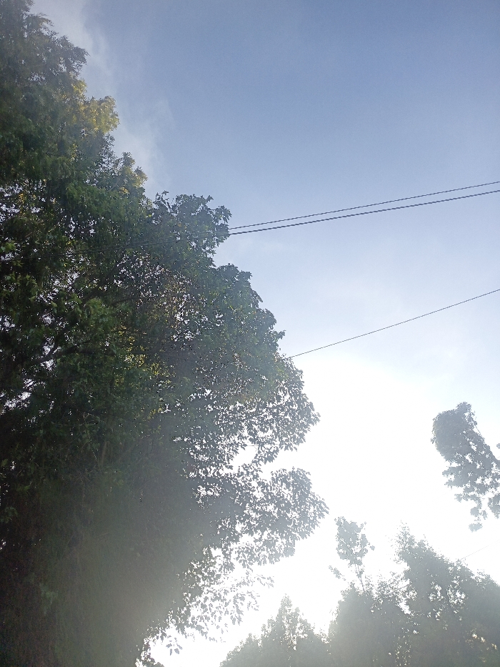 The image presents an outdoor scene located in Ewuaso Oonkidong'i ward, Kenya. The upper two-thirds of the frame is occupied by a light blue sky with diffuse, faint white cloud formations. Two sets of dark, parallel power lines extend horizontally across the mid-ground. The lower and left sections of the image are dominated by dense green foliage from multiple trees, with individual leaves discernible. A significant bright light source, likely the sun, is positioned in the lower right quadrant, creating a strong glare and backlighting parts of the tree canopy. No individuals, animals, or specific actions are observed within the frame.