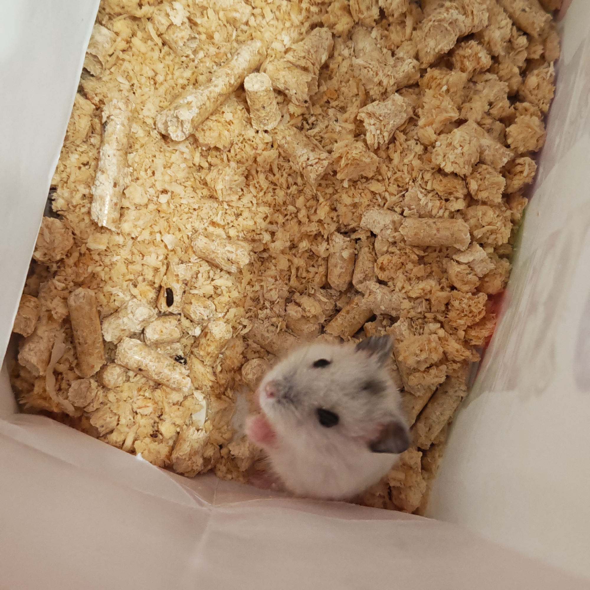 - "An overhead view depicts a small, white hamster with gray markings on its head and ears, and black eyes, partially submerged in light brown pet bedding" by FM-cLarj2, licensed under CC BY 4.0