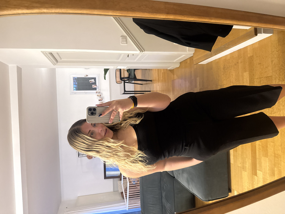 An indoor mirror selfie depicts a blonde female, approximately 20-30 years old, standing in a residence in Rueil-Malmaison, France. She is wearing a black ribbed tank top and black cropped wide-leg trousers. Her right hand, with dark nail polish, holds a light gray smartphone featuring a ridged case and triple-lens camera, used to capture the image. Her left hand is placed in her trouser pocket, and a yellow band is visible on her left wrist. She stands on a light-colored wooden parquet floor, reflected in a full-length mirror with a light wooden frame. The background, visible in the mirror's reflection, includes white walls, a partial view of a dark gray fabric sofa, a wooden baby crib, a dark-framed mirror, a white doorway, a dark dining table with two dark chairs, and a window with hanging photographs and a potted plant.